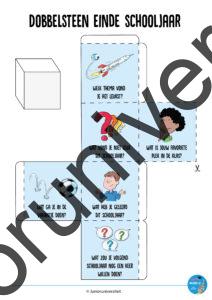 Ga in gesprek met de kinderen over het afgelopen schooljaar. Laat hen om beurten dobbelen met de dobbelsteen. Elke zijde staat voor een bepaalde vraag: