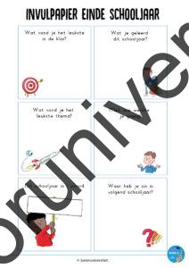 Laat de kinderen dit blad invullen en bewaren in bijvoorbeeld een portfolio. Zo hebben zij later een mooi document om terug te kijken op het afgelopen schooljaar. Je kunt het document ook goed gebruiken als praat-papier. Laat hen middels dit papier een evaluerende gesprek houden met een klasgenoot of ouders over het afgelopen jaar.