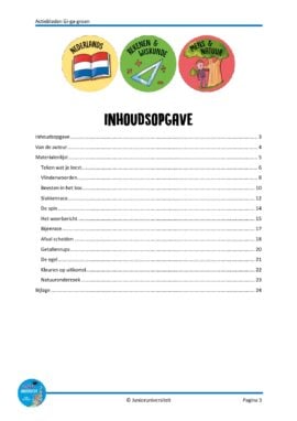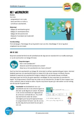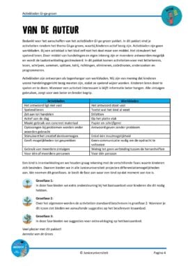 In dit pakket vind je activiteiten rondom het thema Gi-ga-groen, waarbij kinderen actief bezig zijn. Actiebladen zijn geen werkbladen. Bij een actieblad is het blad zelf niet het doel maar een middel. Het stimuleert het spelend leren. Door middel van handelingen en eigen inbreng zijn er meerdere antwoorden mogelijk en wordt de taalontwikkeling gestimuleerd. In dit pakket komen activiteiten voor met letterkennis, lezen, schrijven, sommen, splitsen, telrij, richtingen, elimineren, coördinaten, onderzoeken en programmeren.