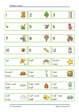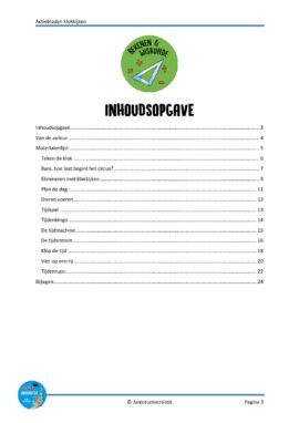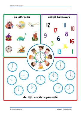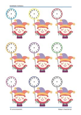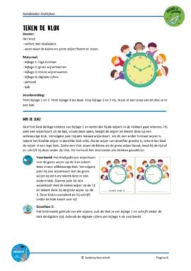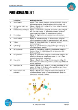 In dit pakket voor groep 3 en 4 vind je activiteiten rondom klokkijken waarbij kinderen actief bezig zijn. Actiebladen zijn geen werkbladen. Bij een actieblad is het blad zelf niet het doel maar een middel. Het stimuleert het spelend leren. Door middel van handelingen en eigen inbreng zijn er meerdere antwoorden mogelijk en wordt de taalontwikkeling gestimuleerd. In dit pakket komen activiteiten voor waarbij kinderen actief het klokkijken automatiseren.