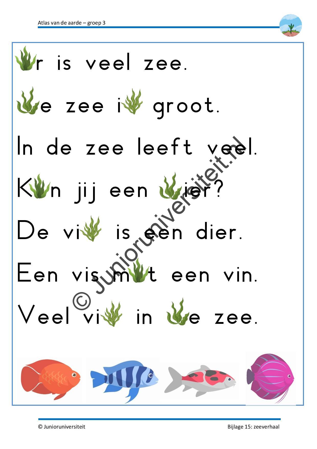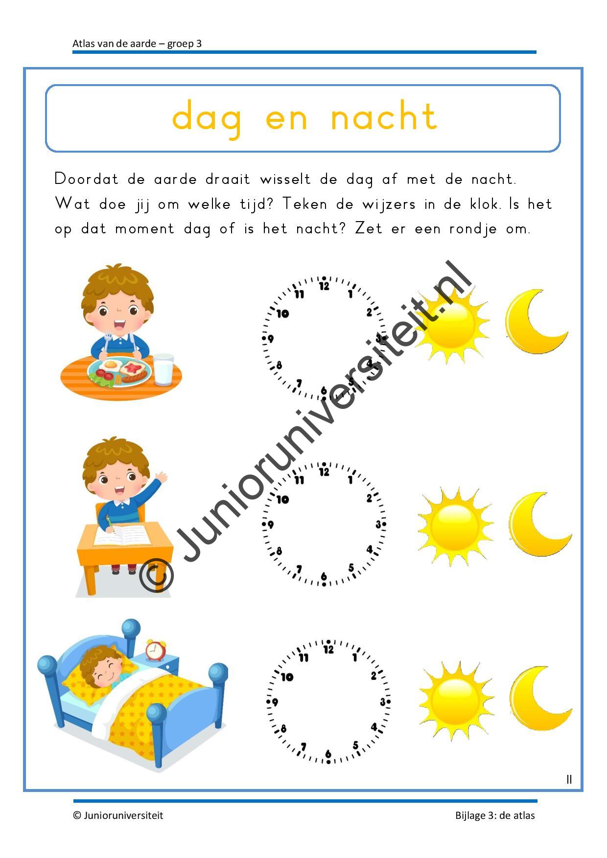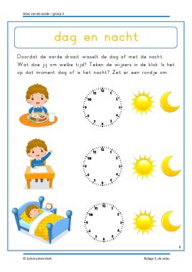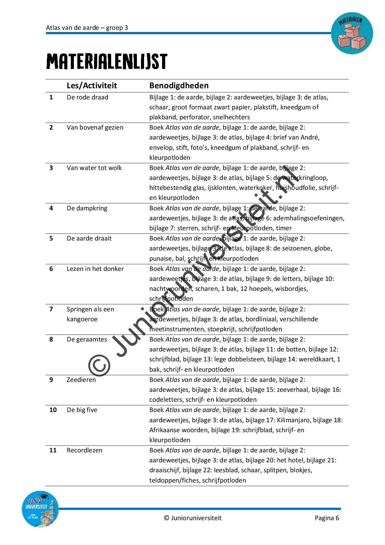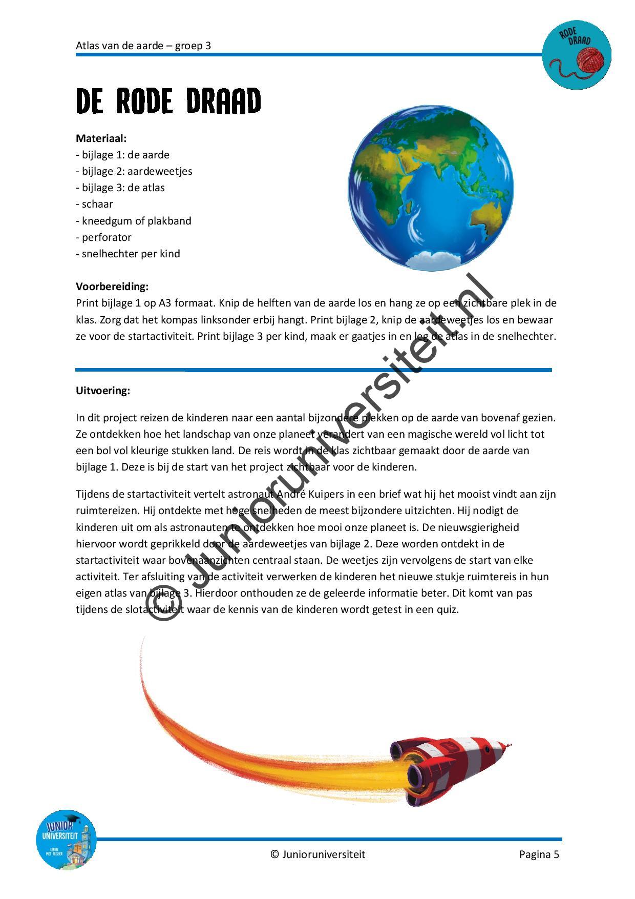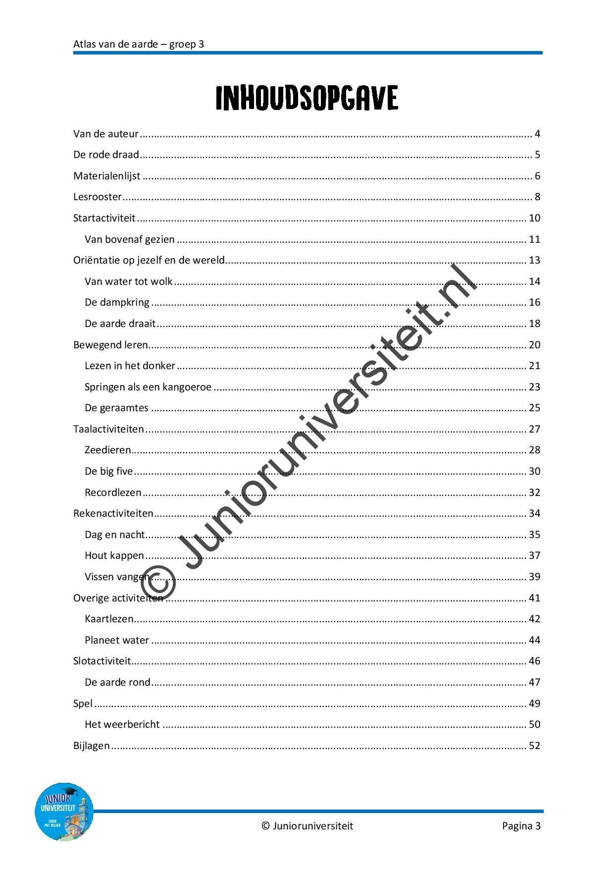 Gedurende het project vullen de kinderen hun eigen atlas. Ze verwerken de waterkringloop, maken de dampkring inzichtelijk en leren hoe de seizoenen tot stand zijn gekomen. Het wordt aanbevolen deze wereldoriënterende activiteiten elkaar op te laten volgen. Daarnaast zijn er verschillende thematische activiteiten rondom taal en rekenen. Zo gaan de kinderen springen als een Australische kangoeroe, ontrafelen ze een zeeverhaal, splitsen ze de gekapte bomen uit het Amazonewoud, lezen de tijd af en maken de woorden van de aangespoelde botten compleet. Ook zijn er drie activiteiten voor bewegend leren, een creatieve les, spelsuggesties voor het weerstation en zetten ze het kompas in bij het kaartlezen.