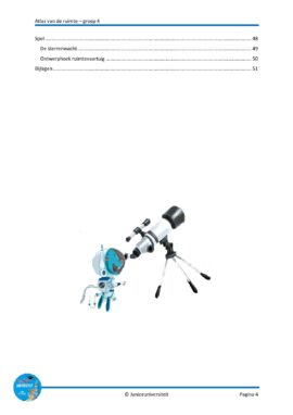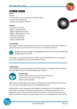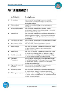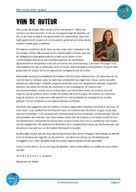 In dit project voor groep 4 ontdekken de kinderen alles over de ruimte en de planeten. Elke activiteit start met een ruimteraadsel, waarna een activiteit volgt op het gebied van wereldoriëntatie, bewegend leren, taal of rekenen. Daarnaast zijn er suggesties opgenomen voor het werken in hoeken. Het project is geschreven bij het boek ‘Atlas van de ruimte’ van André Kuipers & Govert Schilling. Bij dit project vind je ook een lied in MP3 formaat, speciaal geschreven door Jeroen Schipper. Met behulp van dit lied leren de kinderen de volgorde van de planeten.