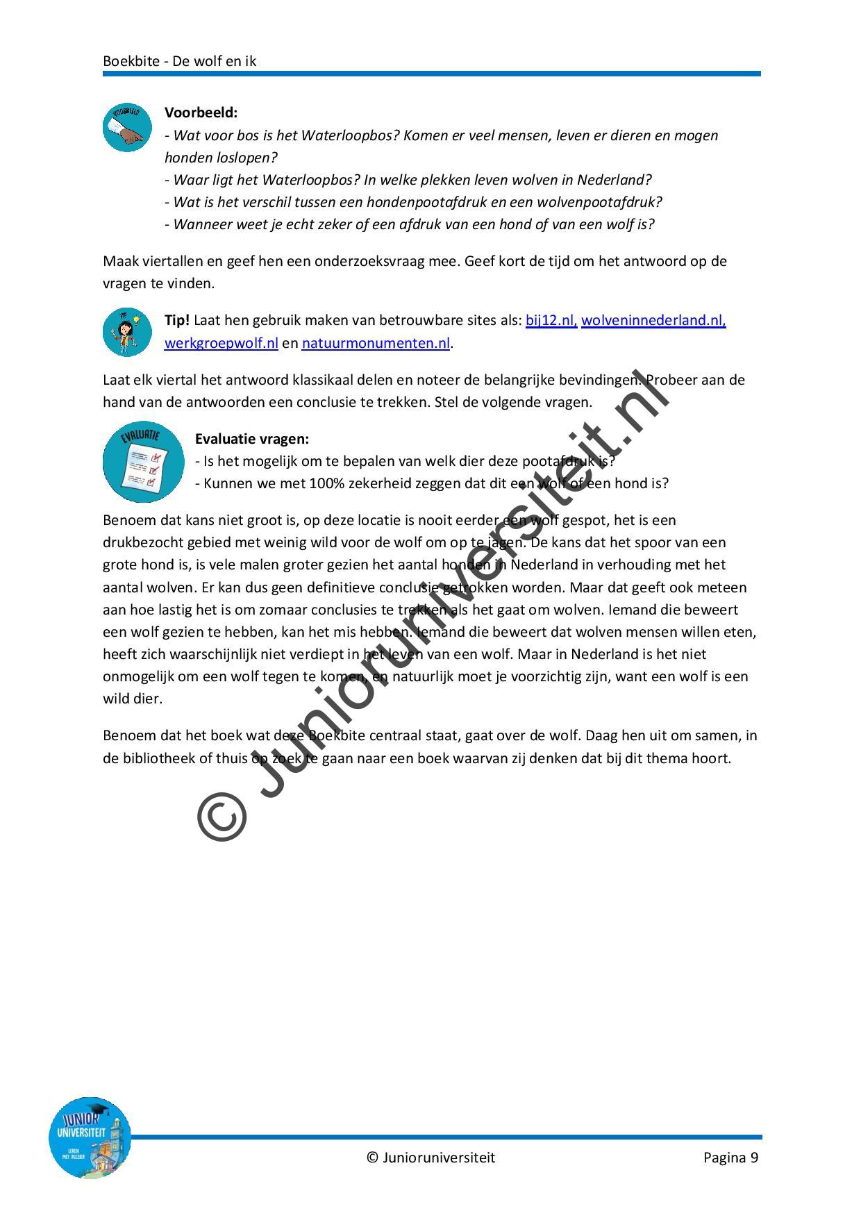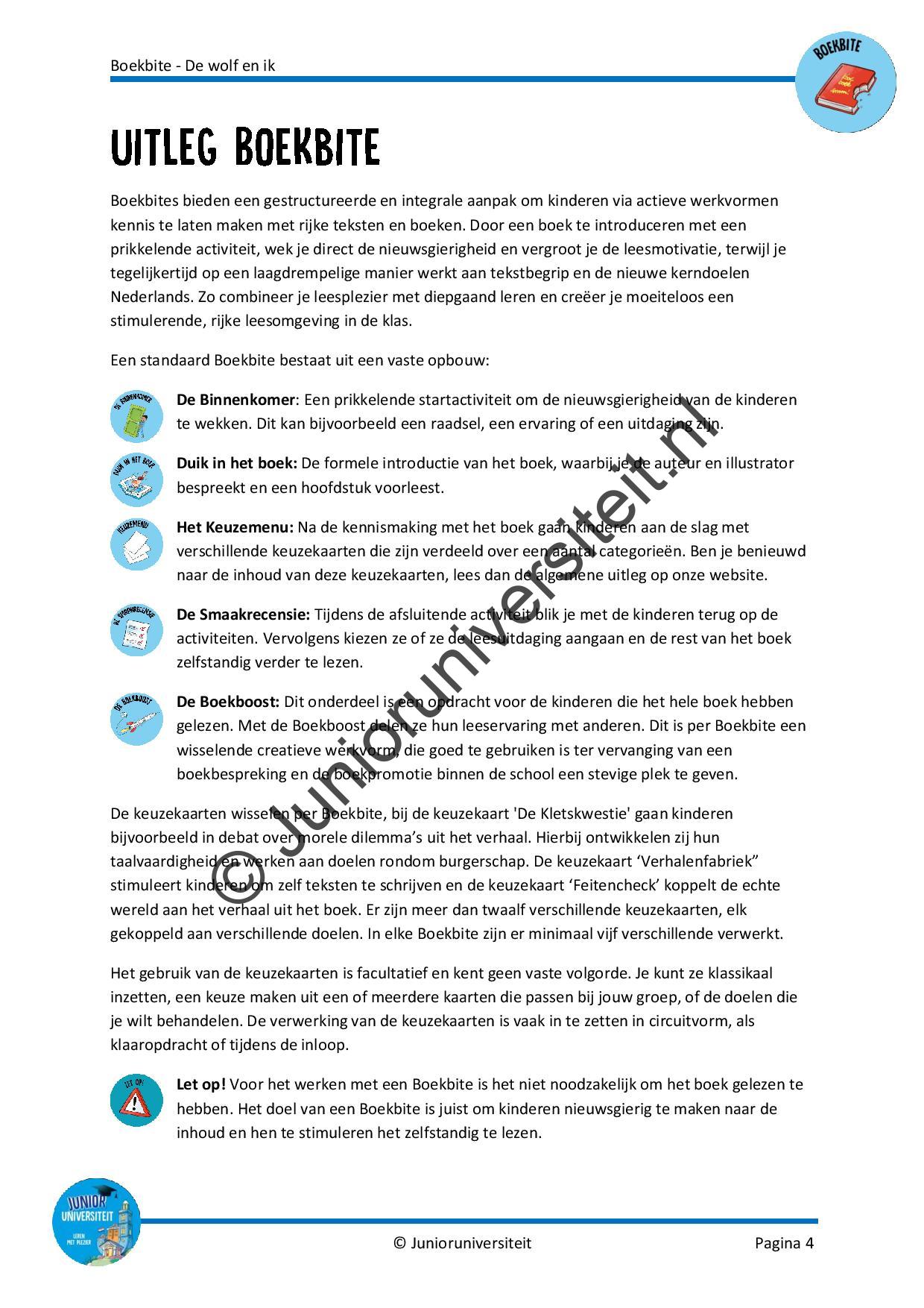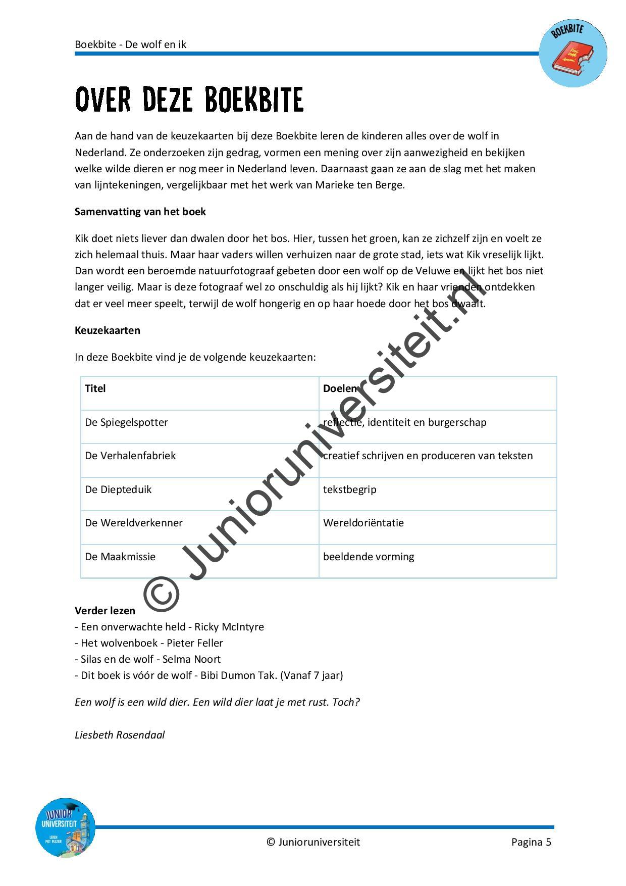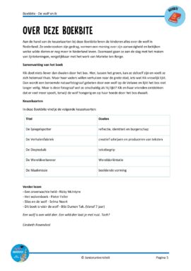 Aan de hand van de keuzekaarten bij deze Boekbite leren de kinderen alles over de wolf in Nederland. Ze onderzoeken zijn gedrag, vormen een mening over zijn aanwezigheid en bekijken welke wilde dieren er nog meer in Nederland leven. Daarnaast gaan ze aan de slag met het maken van lijntekeningen, vergelijkbaar met het werk van Marieke ten Berge. Deze Boekbite is geschreven bij het boek ‘De wolf en ik‘ van Liesbeth Rosendaal met illustraties van Marieke ten Berge