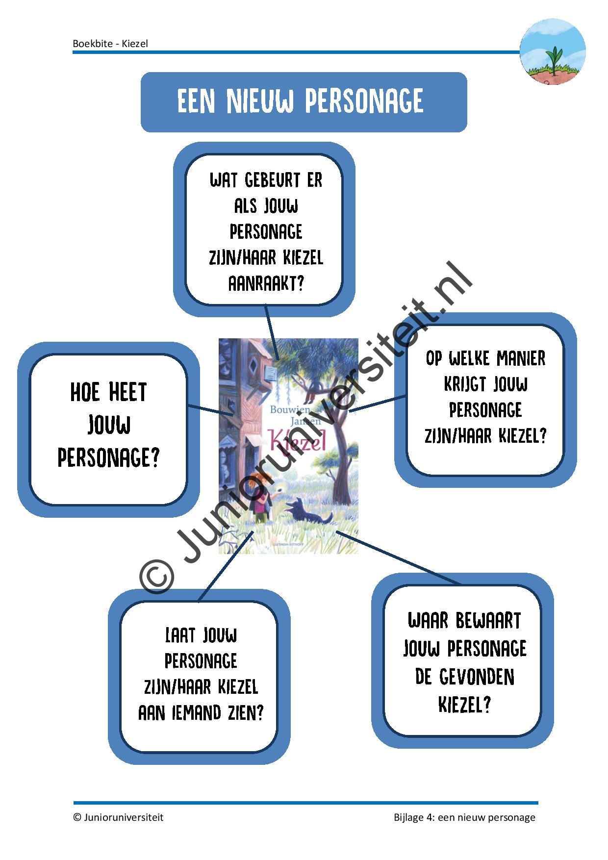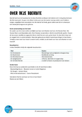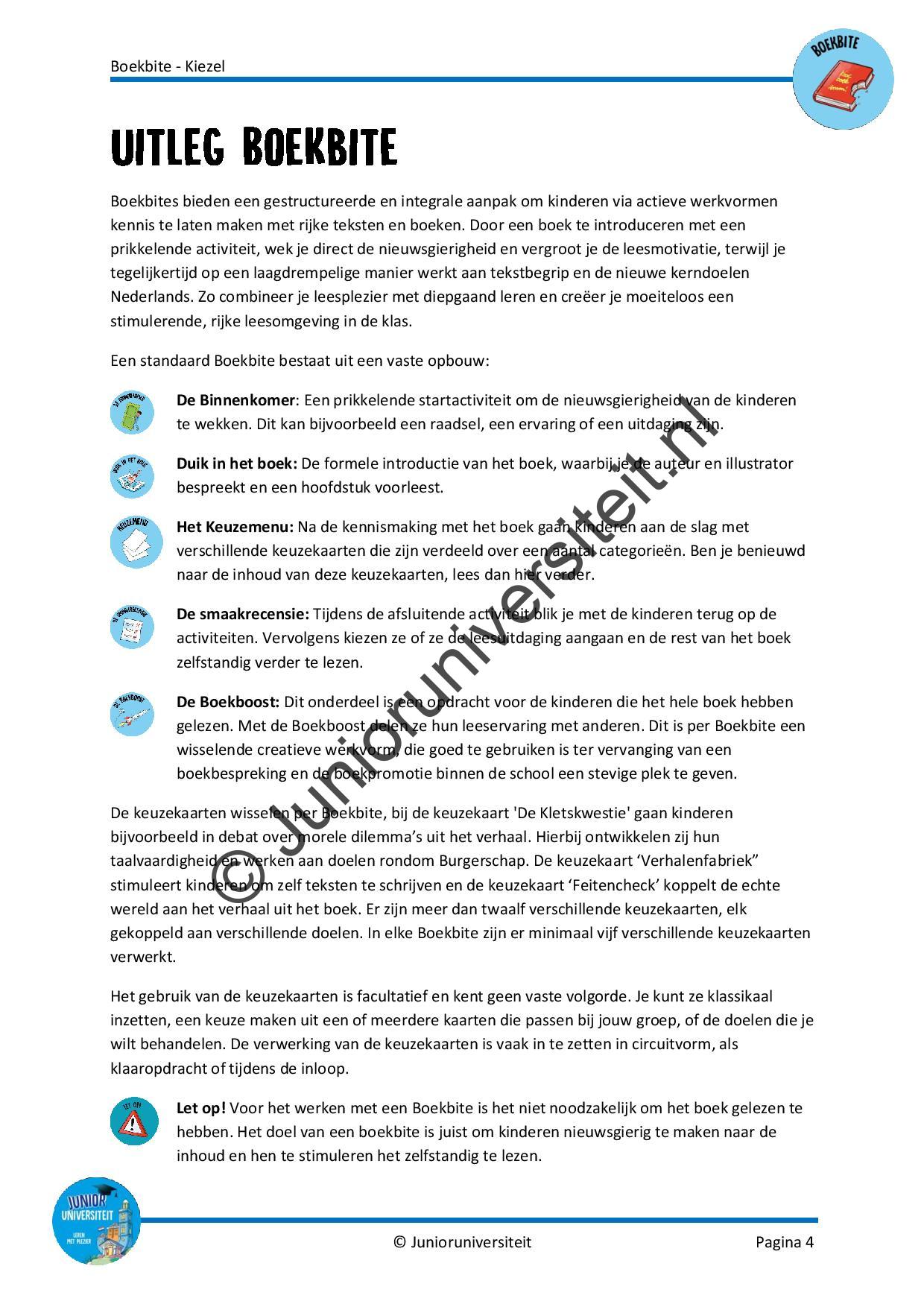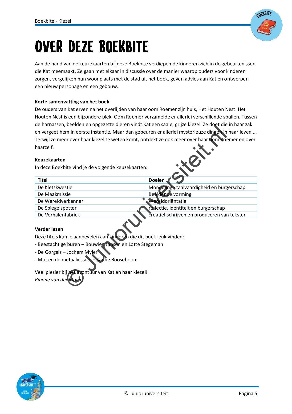 Aan de hand van de keuzekaarten bij deze Boekbite verdiepen de kinderen zich in de gebeurtenissen die Kat meemaakt. Ze gaan met elkaar in discussie over de manier waarop ouders voor kinderen zorgen, vergelijken hun woonplaats met de stad uit het boek, geven advies aan Kat en ontwerpen een nieuw personage en een gebouw. Deze Boekbite is geschreven bij het boek ‘Kiezel’ van Bouwien Jansen met illustraties van Sanne te Loo.