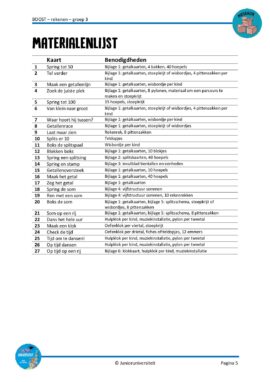 Print vooraf de boosters en lamineer deze. Zet ze in een bak of doe er een ring doorheen zodat je snel de juiste kaart kunt opzoeken. Print het doelenoverzicht van pagina 13 en hang deze op een zichtbare plek. Hierop staan alle doelen die aangeboden worden overzichtelijk weergegeven en wordt benoemd welke booster je hierbij kunt kiezen. Als je een les uit de rekenmethode aan het voorbereiden bent en een deel van de verwerking wilt vervangen door een bewegende activiteit, kun je snel een keuze maken.