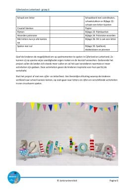 Je sluit het project feestelijk af met een cijfer- en letterfeest waarbij de kinderen verkleed naar school kunnen komen, op zoek gaan naar letters en cijfers en verschillende activiteiten in een circuitvorm spelen. We wensen je heel veel plezier bij dit project en zien jullie graag terug in Cijferland en Letterland!
