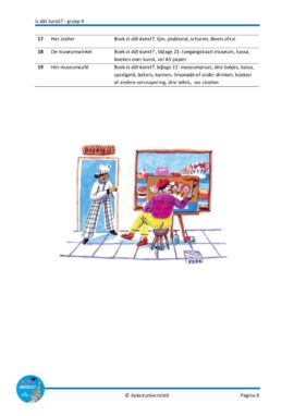 Om het project nog meer tot leven te laten komen zijn er suggesties voor het werken in hoeken opgenomen. In de schilderhoek worden schilderijen gemaakt met verschillende technieken en in het atelier krijgt afval een nieuw leven als kunstwerk. De spelhoek ‘museumwinkel’ is onmisbaar in ieder museum. Hier worden de kaartjes gecontroleerd en souvenirs verkocht. In de spelhoek ‘het museumcafé’ wordt nagepraat over kunst met behulp van de museumpraatkaarten. Mijn advies is om de schilderhoek en het atelier al vroeg in het project in te richten zodat er veel kunst kan worden gemaakt. Met de spelhoeken ‘museumwinkel’ en ‘museumcafé’ bereid je de opening van het museum voor. De opbouw van alle hoeken is in stappen beschreven. Pas het tempo aan de behoeftes van de kinderen aan. Voeg steeds elementen toe om het spel in de hoeken interessant en uitdagend te houden.