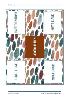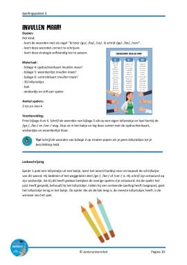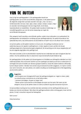 Binnen elke categorie biedt het pakket twee verschillende spellen, zodat je kunt afwisselen in je spelaanbod. De laatste twee spellen, de categoriemixspellen, zijn uitgebreidere spellen, bedoeld om te spelen wanneer de categorieën zelf al individueel zijn aangeboden. De spellingsspellen zijn bedoeld ter verrijking op jouw spellingsonderwijs. De spellen bevorderen het spelenderwijs leren, het enthousiasme van de kinderen en heeft ‘met en van elkaar leren’ als basis.