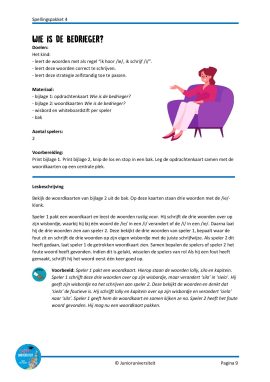 Binnen elke categorie biedt het pakket twee verschillende spellen, zodat je kunt afwisselen in je spelaanbod. De laatste twee spellen, de categoriemixspellen, zijn uitgebreidere spellen, bedoeld om te spelen wanneer de categorieën zelf al individueel zijn aangeboden. De spellingsspellen zijn bedoeld ter verrijking op jouw spellingsonderwijs. De spellen bevorderen het spelenderwijs leren, het enthousiasme van de kinderen en heeft ‘met en van elkaar leren’ als basis.