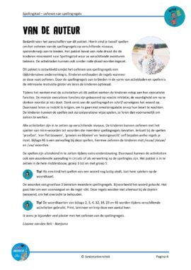 In dit pakket vind je twaalf spellen om het oefenen van de spellingregels op verschillende niveaus, spelenderwijs aan te bieden. Het pakket bevat een rode draad die de kinderen meeneemt naar Spellingstad waar ze verschillende avonturen beleven. De actiebladen kunnen ook zonder rode draad worden ingezet.