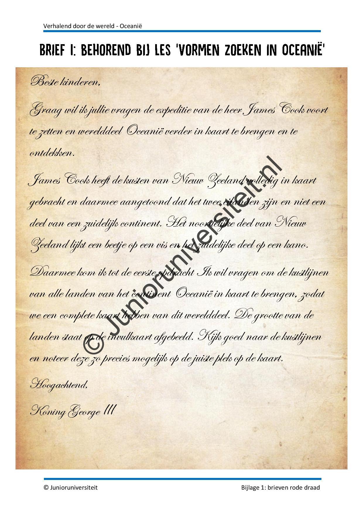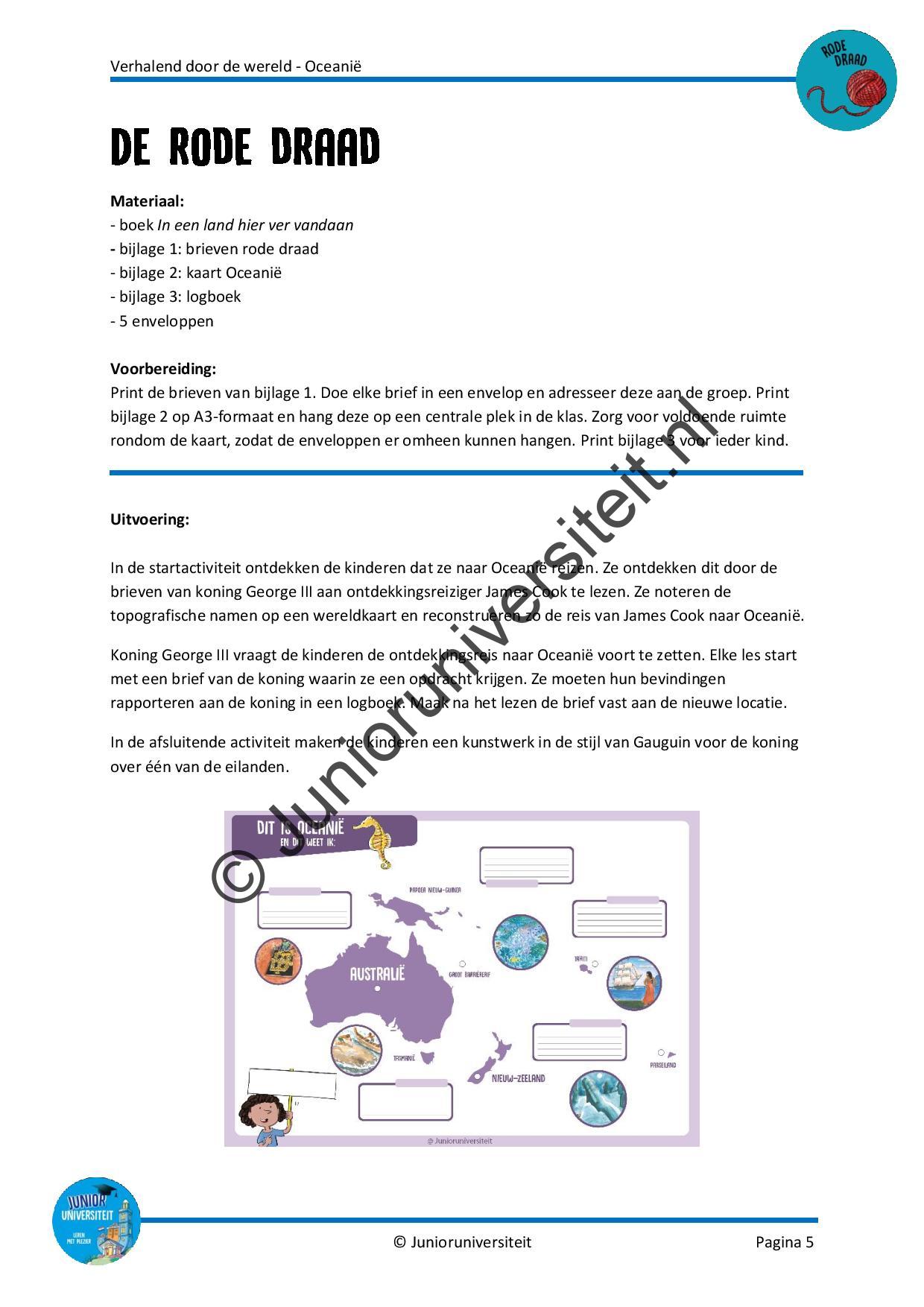 De verhalen uit het boek In een land hier ver vandaan vormen de rode draad in dit project. In elk verhaal staat een bijzondere plek, persoon of verhaal uit Oceanië centraal. In de startactiviteit ontdekken de kinderen dat ze naar Oceanië reizen, door de brieven van koning George III voor ontdekkingsreiziger James Cook te lezen. Elke les start met een brief van koning George III waarin hij de kinderen een opdracht geeft. Ze moeten op ontdekkingsreis door Oceanië en hun bevindingen rapporteren aan de koning.