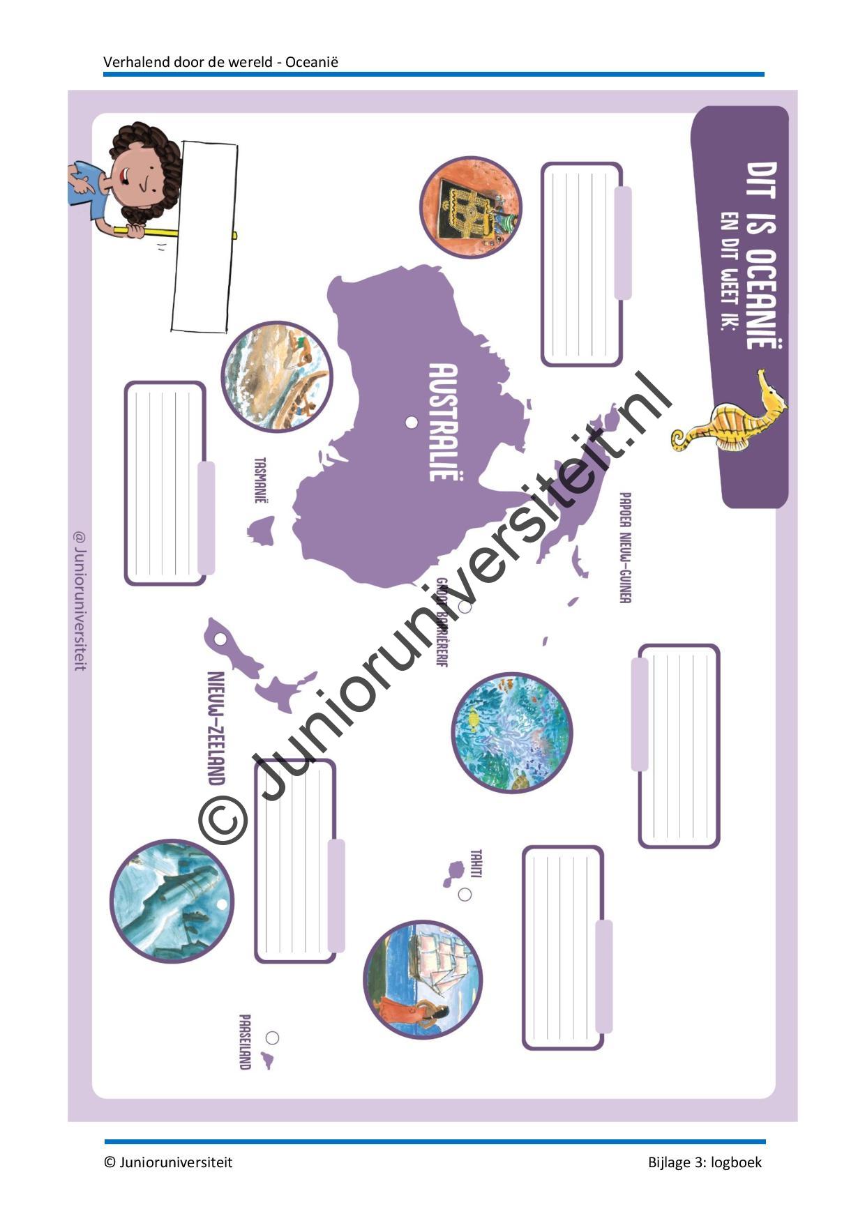 In dit kleine project wordt de topografie van werelddeel Oceanië in een betekenisvolle context en in samenhang met andere vakken aangeboden. Dit project is geschreven bij het boek ‘In een land hier ver vandaan’, geschreven door Arend van Dam en geïllustreerd door Alex de Wolf. De verhalen uit dit boek vormen de rode draad in het project.